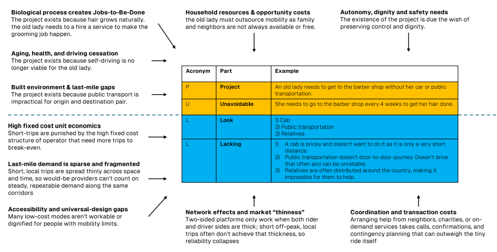 If we look at the enabling factors we can see that the project persists at the intersection of multiple concepts and phenomenon. The project entails a recurring JTBD, time-boxed urgency, reduced self-driving ability, last-mile transit gaps, resource and reliability constraints, autonomy and safety needs, and coordination frictions.